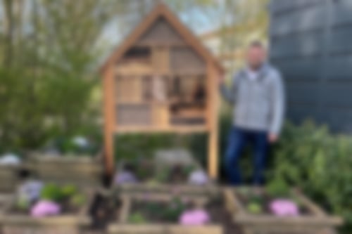 Und das ist richtig schön geworden. Denn der Sportverein hat mit finanzieller Unterstützung der Kreissparkasse Steinfurt und auch der Gemeinde ein richtiges Paradies für Insekten geschaffen. Denn hier steht nicht nur ein großes Insektenhotel, sondern drumherum wurden mit Bienenfreundlicher Bepflanzung und Erde sowie Mulch auch Nistplätze für Wildbienen auf dem Boden geschaffen. „Das ist quasi ein Insektenhotel mit Vollpension“, erklärt Hoffeld grinsend.